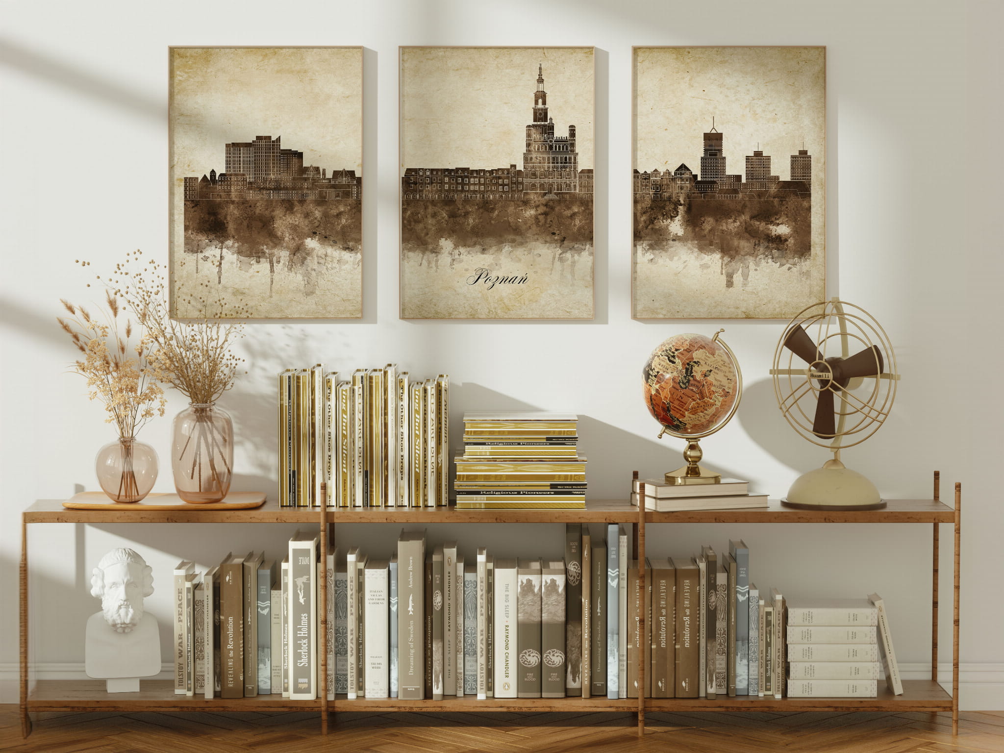 Tryptyki skyline w stylu vintage to nowoczesne dzieła sztuki, które nawiązują do estetyki minionych dekad. Przedstawiają miejskie krajobrazy w retro kolorystyce, z wyblakłymi barwami i z delikatną patyną czasu. Kontury są często zmiękczone, a szczegóły budynków lekko stylizowane, co dodaje im nostalgicznego uroku. Tła plakatów utrzymane są w odcieniach przypominających stary papier, z subtelnymi teksturami i ciepłymi, przygaszonymi tonami. Całość tworzy elegancki i przytulny klimat, idealny do wnętrz, które łączą nowoczesność z klasycznym wdziękiem.