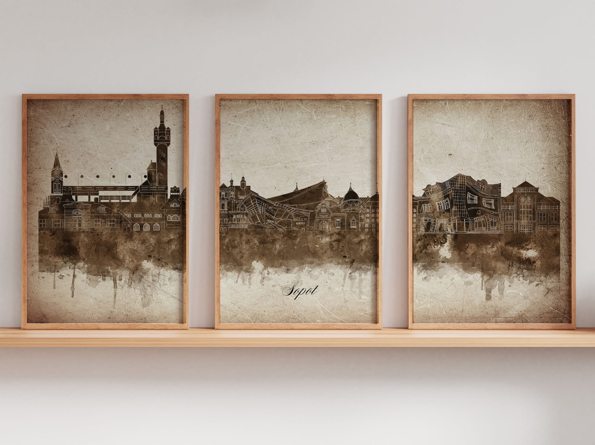 Tryptyk Skylines Sopot w stylu Vintage, Styl akwarelowy
