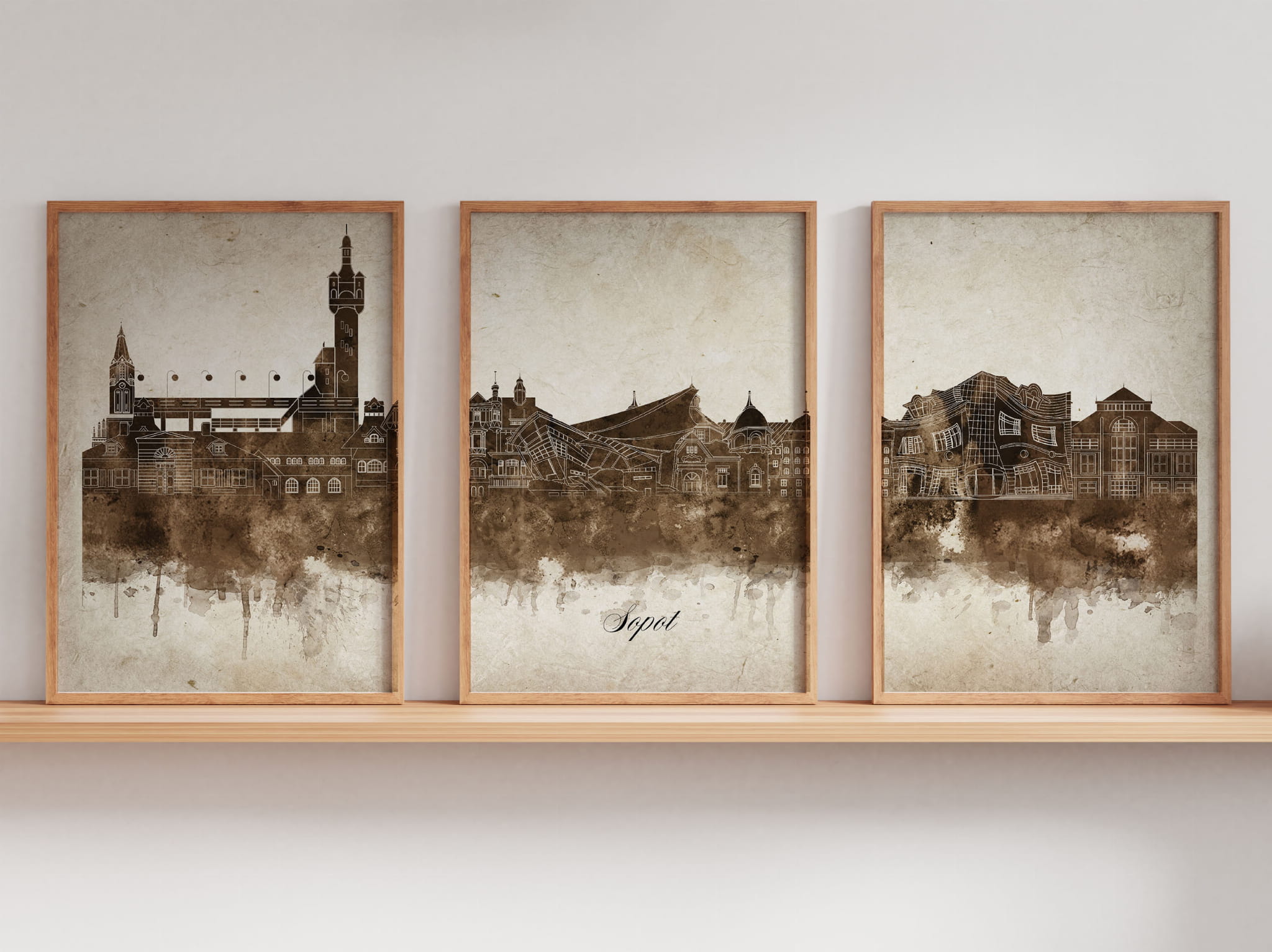 Tryptyk Skylines Sopot w stylu Vintage, Styl akwarelowy