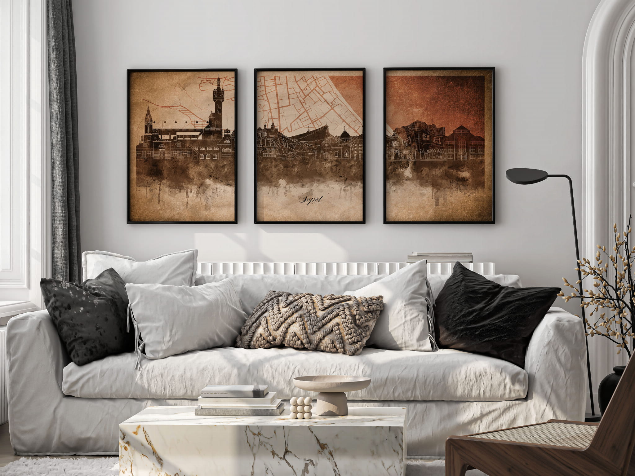 Tryptyki skyline w stylu vintage to nowoczesne dzieła sztuki, które nawiązują do estetyki minionych dekad. Przedstawiają miejskie krajobrazy w retro kolorystyce, z wyblakłymi barwami i z delikatną patyną czasu. Kontury są często zmiękczone, a szczegóły budynków lekko stylizowane, co dodaje im nostalgicznego uroku. Tła plakatów utrzymane są w odcieniach przypominających stary papier, z subtelnymi teksturami i ciepłymi, przygaszonymi tonami. Całość tworzy elegancki i przytulny klimat, idealny do wnętrz, które łączą nowoczesność z klasycznym wdziękiem.