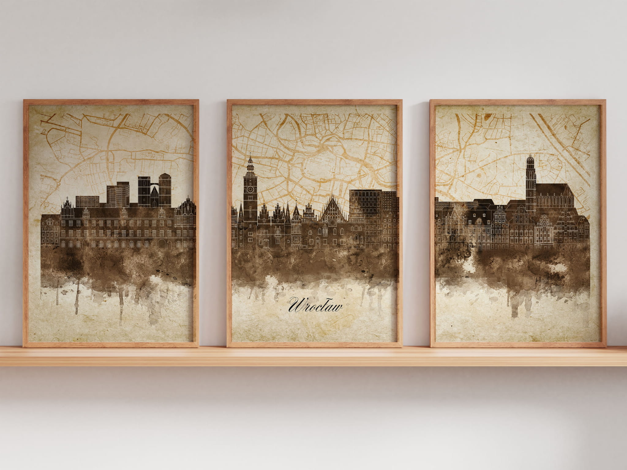 Tryptyk Skylines Wrocław w stylu Vintage, Styl akwarelowy