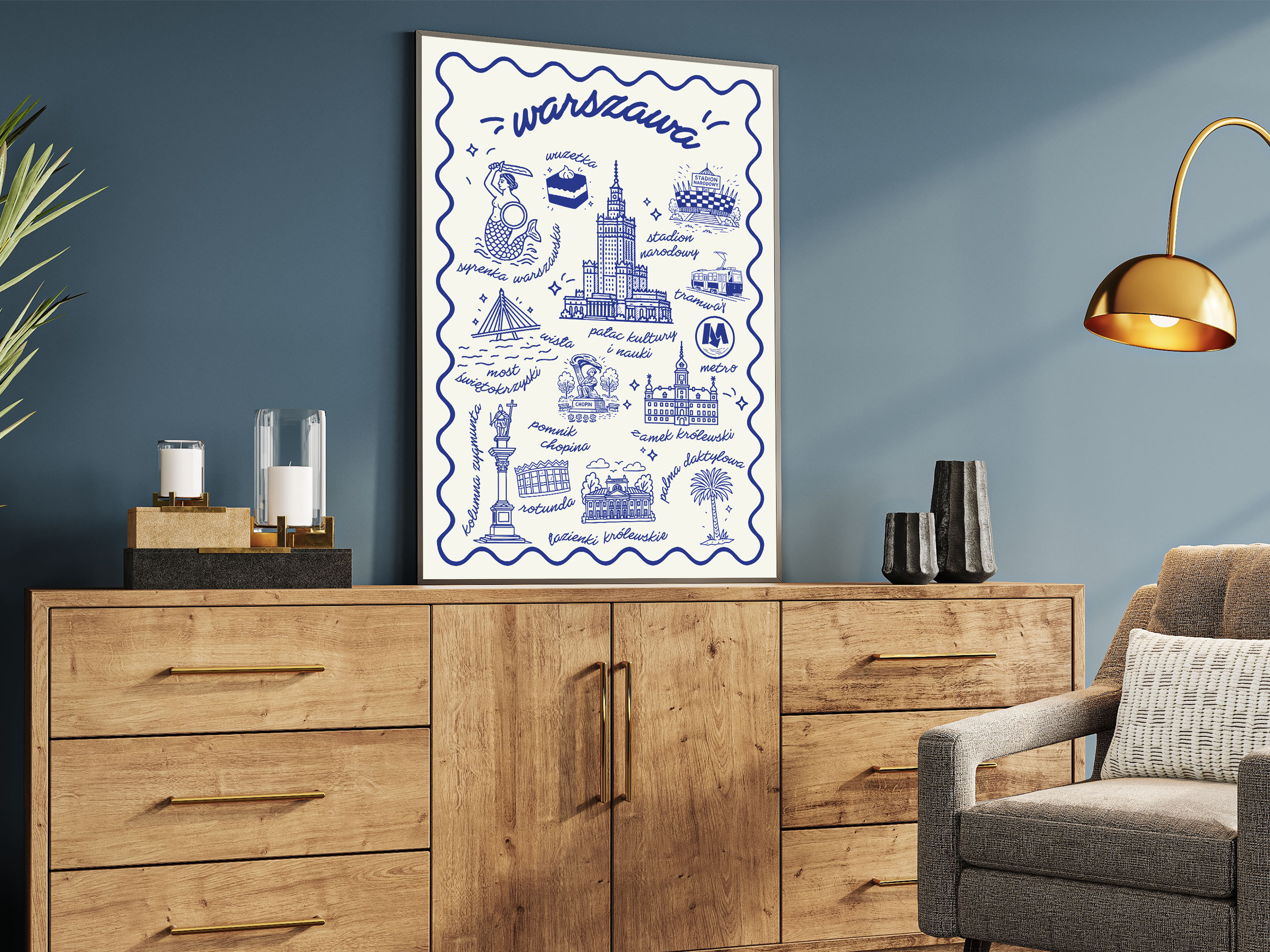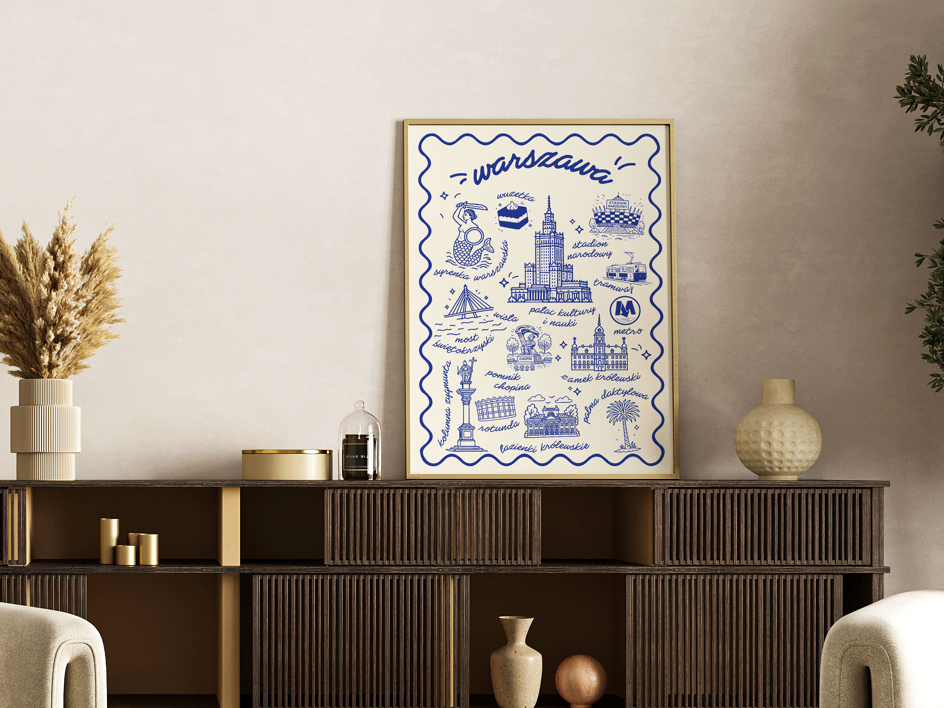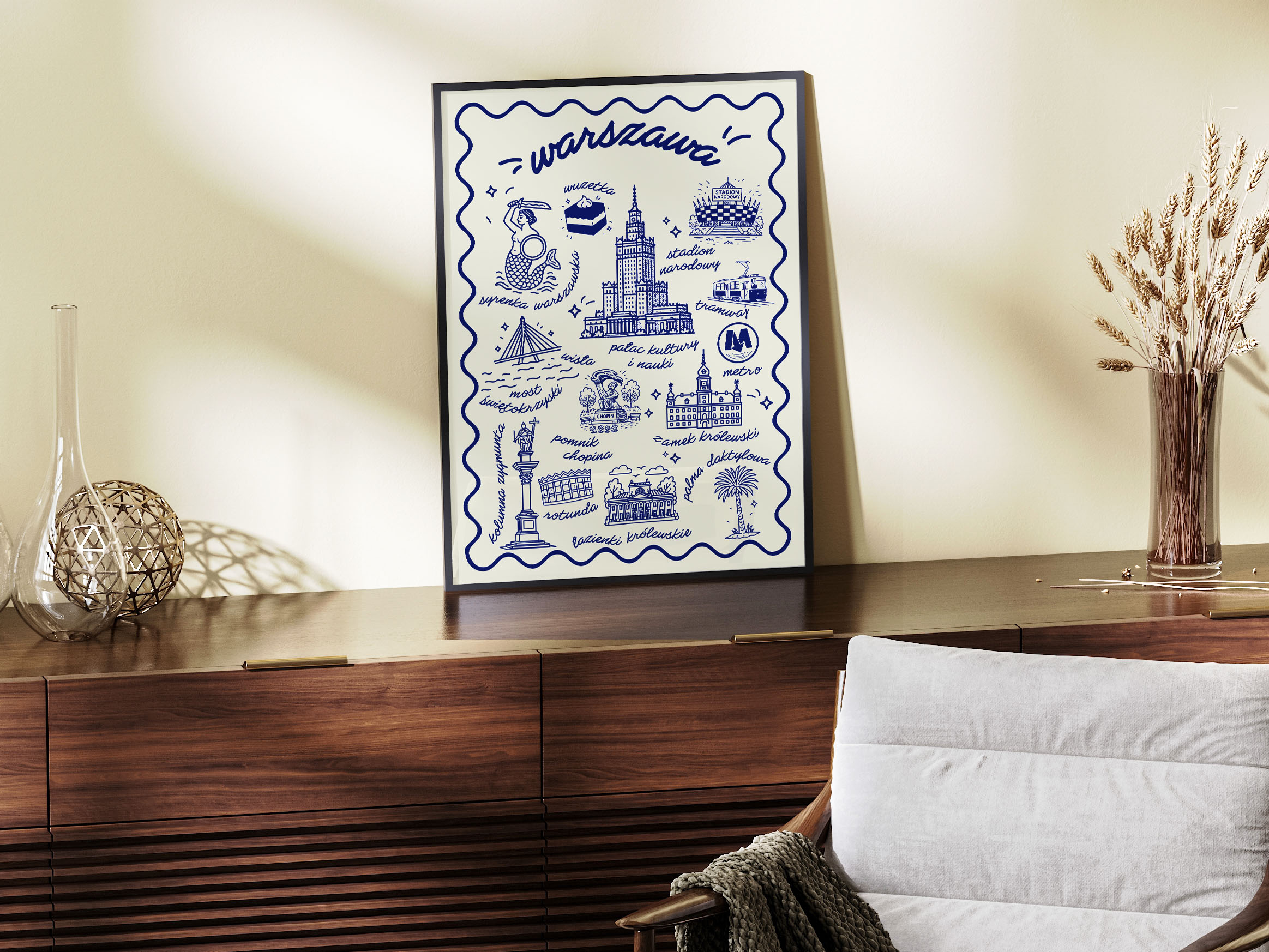 Ilustrowany plakat Warszawy – pełen symboli, które tworzą charakter stolicy