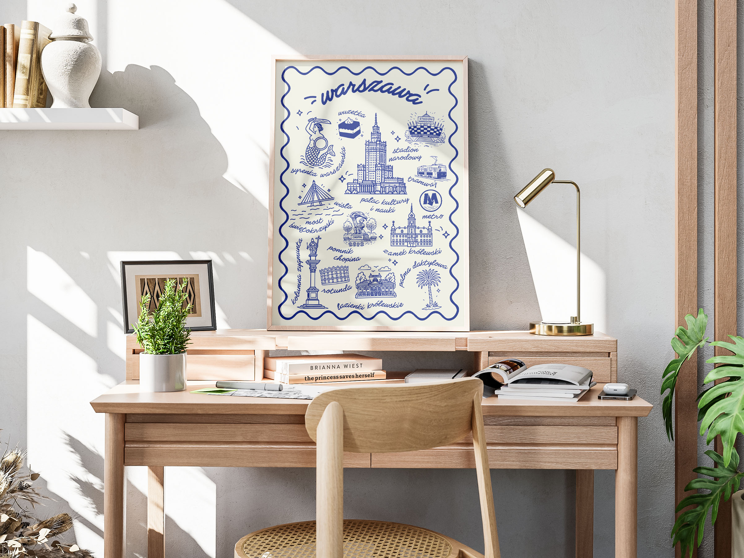 To świetny wybór dla osób, które kochają stolicę — mieszkają tu, wspominają ją albo dopiero odkrywają jej wyjątkowy charakter. Plakat sprawdzi się w salonie, sypialni, biurze, pokoju dziecka czy przestrzeni kreatywnej.