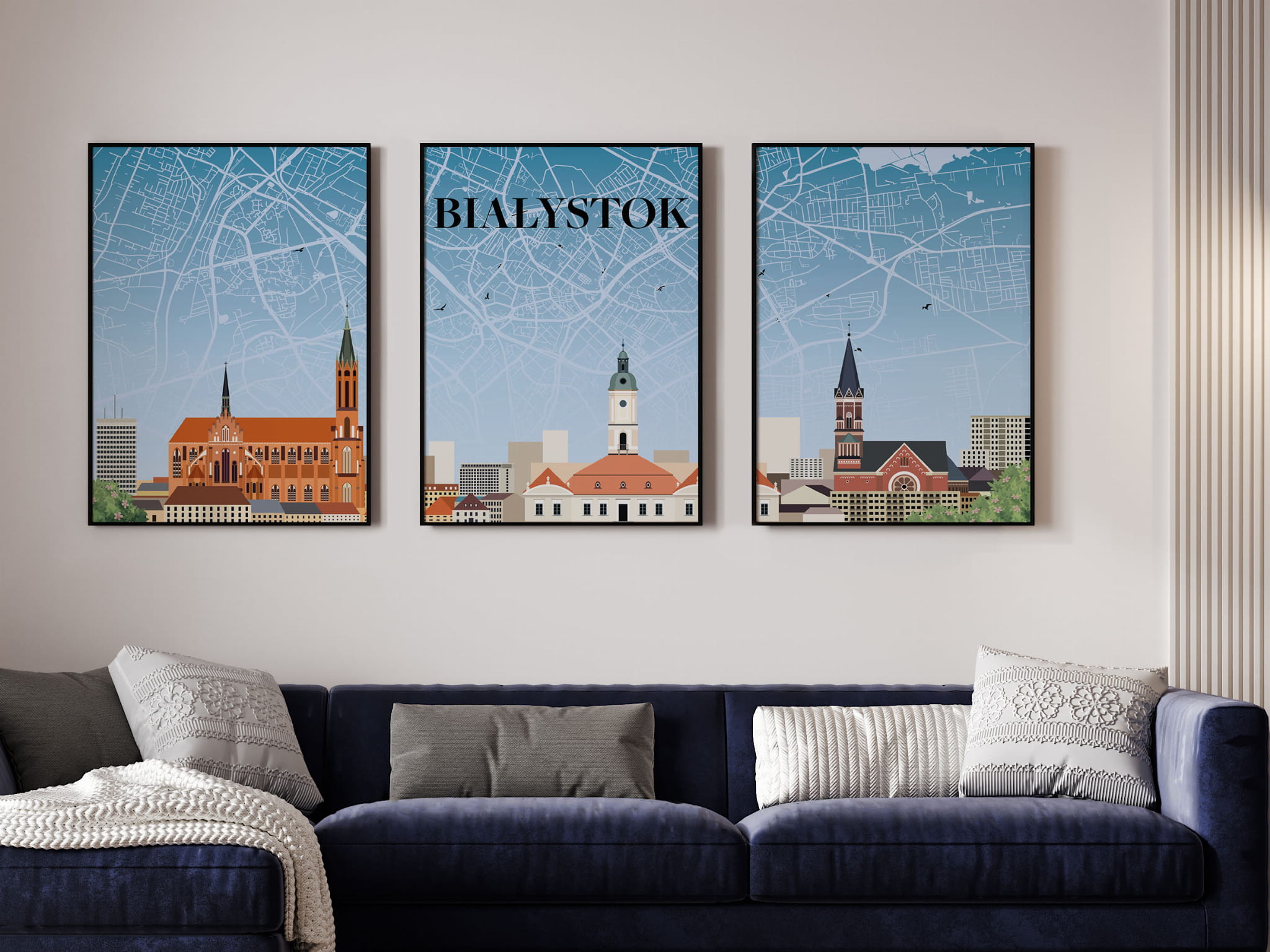 Zestaw 3 plakatów podróżniczych, TRYPTYK Białystok z mapą