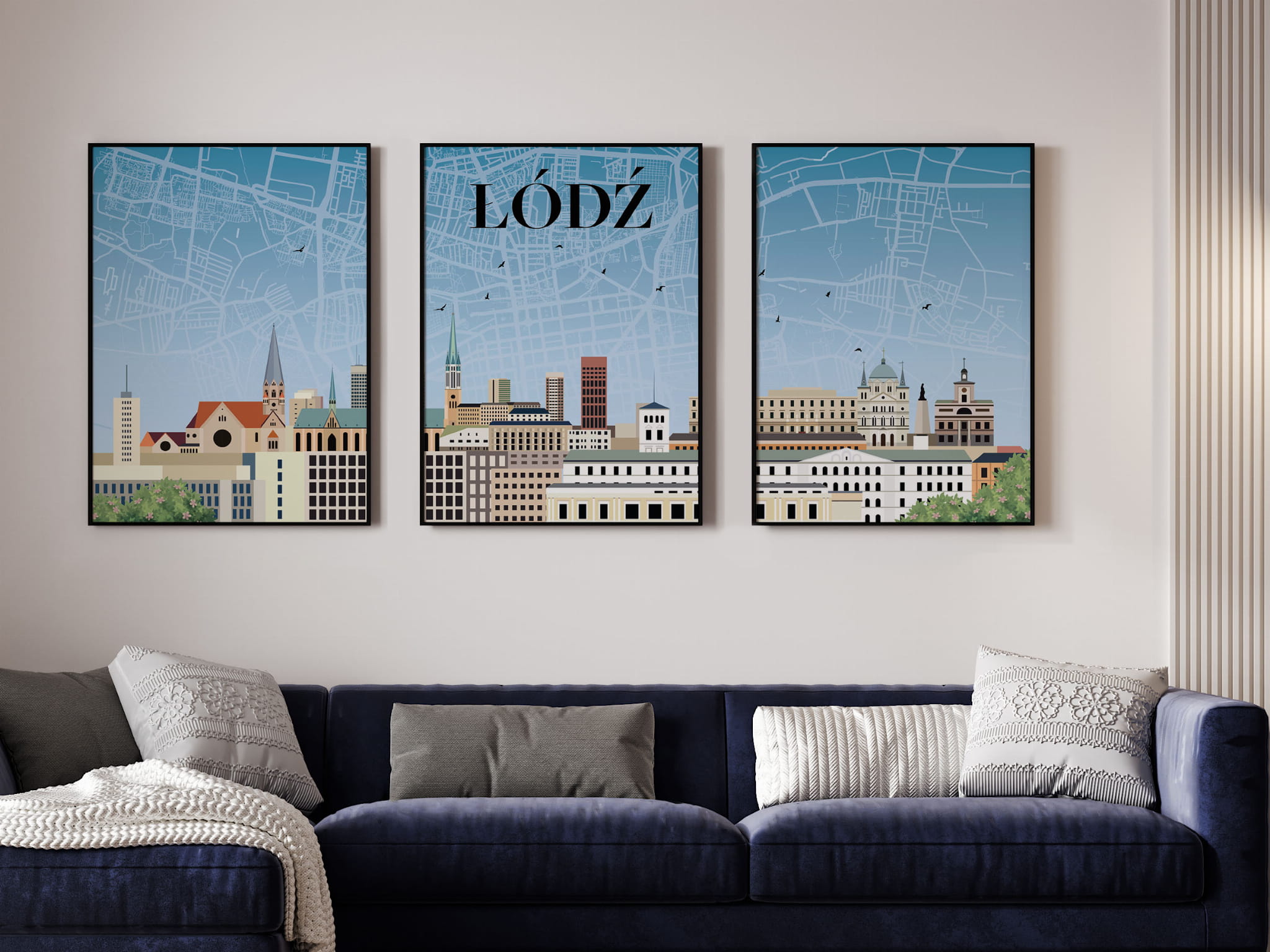 Zestaw 3 plakatów podróżniczych, TRYPTYK Łódź z mapą
