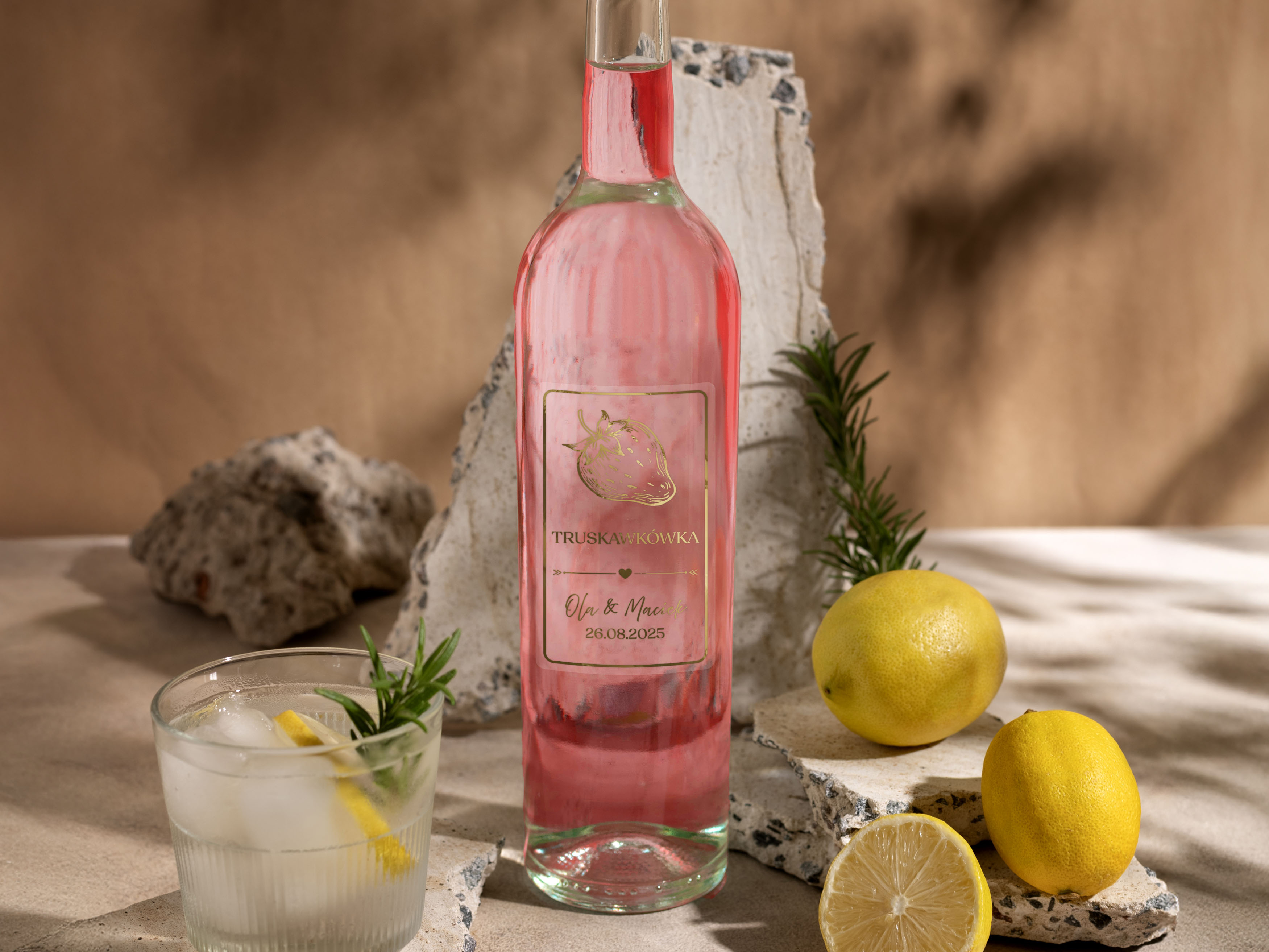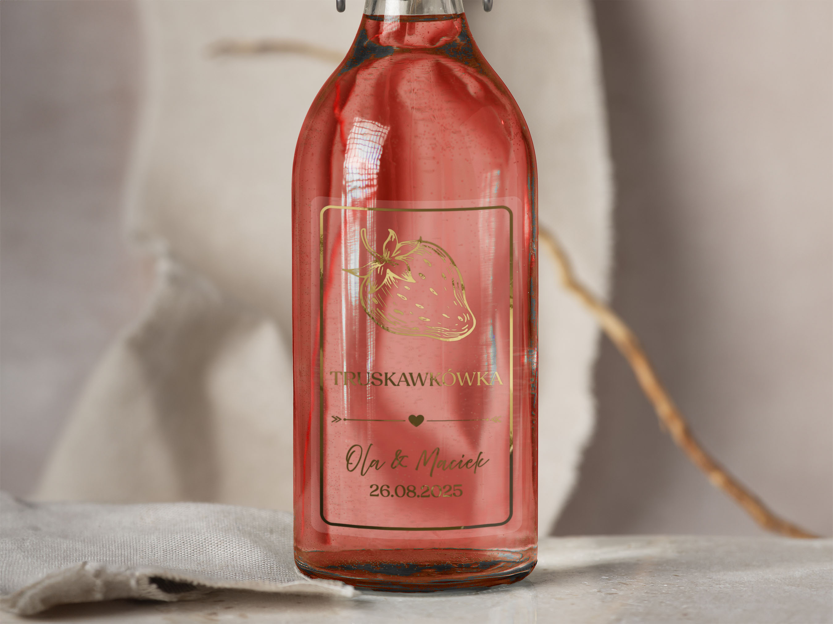 Złocone naklejki na alkohol weselny- Truskawkówka, Truskawka. Złocone Etykiety na Alkohol